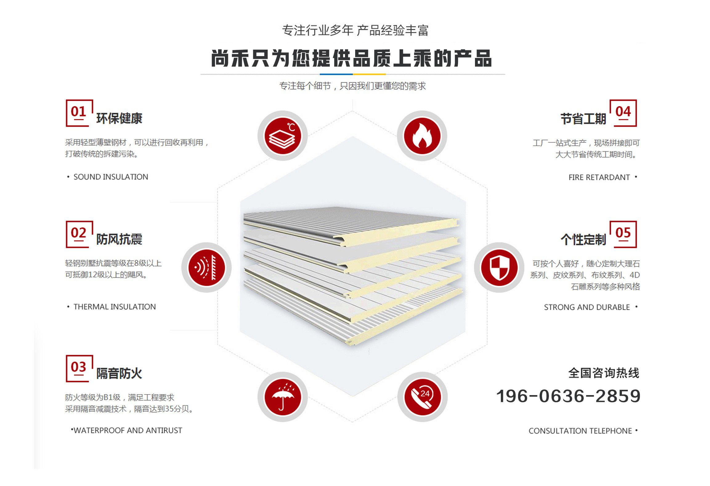 山東尚禾經(jīng)貿(mào)有限公司是集板材設(shè)計(jì)、研發(fā)、生產(chǎn)、施工、一體化的科技公司,并在同行業(yè)中率先通過(guò)了質(zhì)量、環(huán)境、安全管理體系認(rèn)證。公司2011年投入資金2000余萬(wàn)元引進(jìn)世界先進(jìn)的聚氨酯節(jié)能板連續(xù)生產(chǎn)線、意大利進(jìn)口發(fā)泡系統(tǒng),采用六組份在線自動(dòng)操作混合澆注技術(shù),在線一次性完成社會(huì)配料中心或工廠的配比混合工藝,并可以根據(jù)溫度在線自動(dòng)調(diào)整,從而生產(chǎn)處與眾不同的高強(qiáng)度、節(jié)能型、綠色環(huán)保的聚氨酯夾芯板。(其使用年限高于同行業(yè)其他品牌5-10年) 公司主要經(jīng)營(yíng)范圍包括聚氨酯夾芯板,PU夾芯板,冷庫(kù)板,潔凈板,聚氨酯冷庫(kù)板,冷庫(kù)保溫板的設(shè)計(jì)、生產(chǎn)、銷售、技術(shù)指導(dǎo)、安裝及一體、以及進(jìn)出口業(yè)務(wù),是中部六省最大的綠色節(jié)能建材生產(chǎn)基地。聚氨酯夾芯板年產(chǎn)200萬(wàn)平方米、PU夾芯板、冷庫(kù)保溫板500萬(wàn)平方米、鏈整產(chǎn)業(yè)綜合實(shí)力,開(kāi)創(chuàng)了六省至中西部創(chuàng)新型中小名企總部基地,并將著力推進(jìn)中國(guó)中西部地區(qū)集成房屋住宅產(chǎn)業(yè)化發(fā)展進(jìn)程?! 】萍紕?chuàng)新、節(jié)能典范。千萬(wàn)間始終秉承“誠(chéng)信、合作”的企業(yè)文化精髓,長(zhǎng)期致力于鋼板材結(jié)構(gòu)節(jié)能建筑產(chǎn)業(yè),愿與社會(huì)各界攜手合作,共鑄綠色、環(huán)保美好未來(lái)。 產(chǎn)品具有良好的絕熱、阻燃、隔音、環(huán)保、耐久性能,可廣泛應(yīng)用于工業(yè)、商用建筑內(nèi)外墻、以及民用建筑外墻保溫、空調(diào)通風(fēng)系統(tǒng)、專用防火保溫門(mén)等領(lǐng)域?! ∥覀兪冀K秉承...